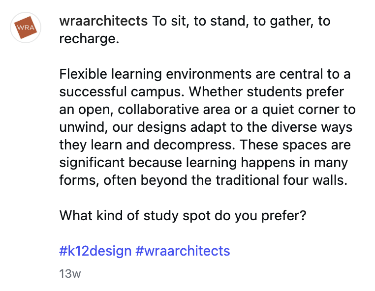 Strategically designed and curated Instagram content that reinforces WRA Architects’ identity as a vibrant, collaborative, people-first firm, infusing the brand’s digital presence with energy and personality.